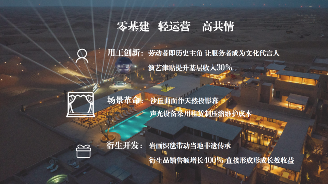 第一,要具备“资源赋魅”能力。这里的“赋魅”包括两个维度:一是数字(科技)赋魅,尤其是借助数字创造力为资源注入新活力。我们看到很多精品案例的发展,都与时代发展、科技进步同频共振,比如将数字技术运用到故事叙事中。上午杜老师也强调,今天的文旅不仅要“做好产品”,更要“讲好故事”,而且叙事方式正在从“官方统一中心化”转向“去中心化、共创化”。每一位游客、消费者,既是体验者,也是参与者、共创者——他们不仅深度体验产品,还能在叙事过程中贡献力量,形成共同价值。二是文化赋魅、艺术赋魅。这正在成为打造精品的重要路径。案例告诉我们,“赋魅”不是简单地将艺术作品植入产品,而是让艺术成为所有旅游吸引物、旅游产品的内在特征。比如沙漠酒店,它本身更像一件艺术品,再叠加大漠岩画、非遗地毯、活化的边塞诗词,以及员工共创的演艺,形成了立体的文化艺术体验。可以说,数字赋魅、艺术赋魅,是打造精品的核心途径。