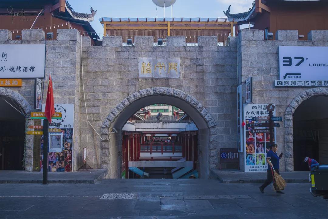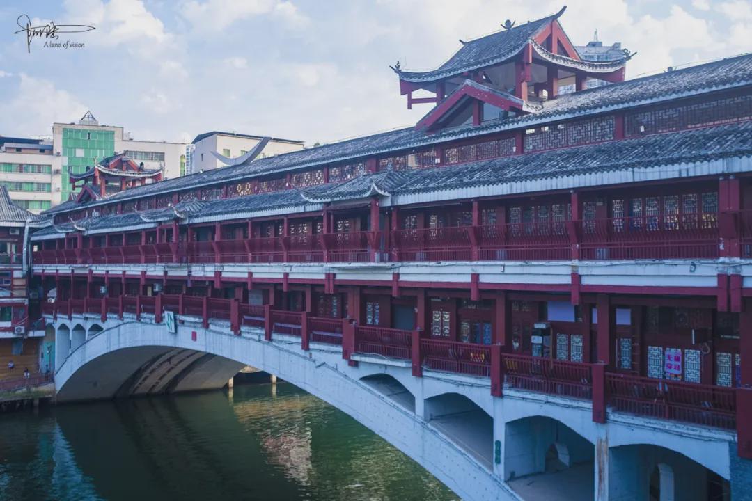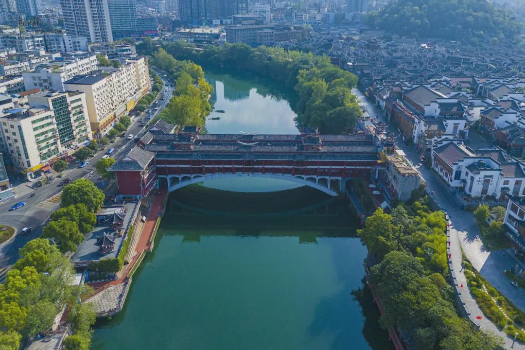 这座“兴市桥”其实地处碧江区的市中心地带,西接大江坪路(原客车站),东南边则是公园路及原市政府所在地。它全长约200米,桥面宽12米,采用的是红墙青瓦的侗族传统设计,外观与碧水白拱相映成趣,算是这里最引人瞩目又确实最具民族特色的地标建筑。