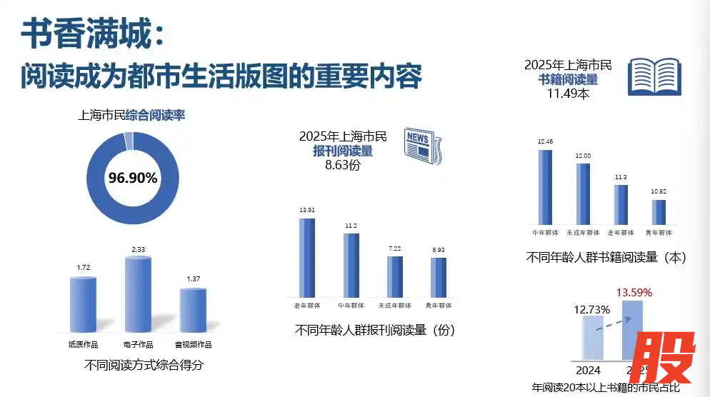 年阅读20本书以上的读者属于“深阅读群体”,上海这个群体的读者正在扩大,2025年约占13.59%,高于2024年的12.73%。